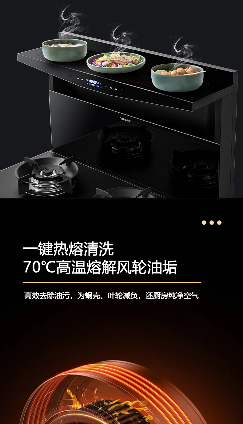 1050Pa風壓,智能變頻電機,揮手智控,曲面滑體無縫風道,一體瓷膜內膽,一鍵熱融清洗,5kW大火力